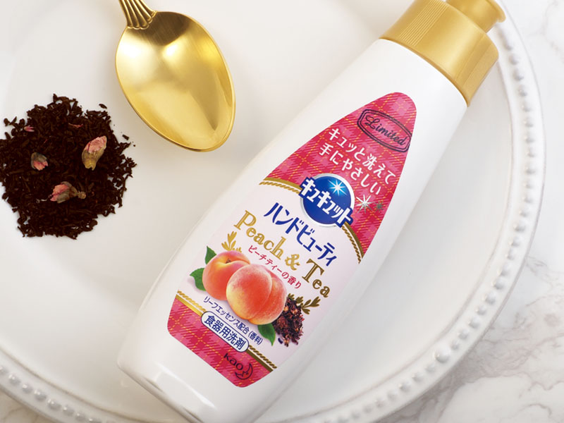 キュキュットハンドビューティの期間限定企画品のパッケージデザイン。手肌をいたわるスキンケア発想の食器用洗剤であることから通常のキュキュットシリーズに比べ柔らかで優雅なテイストを意識してデザインしました。